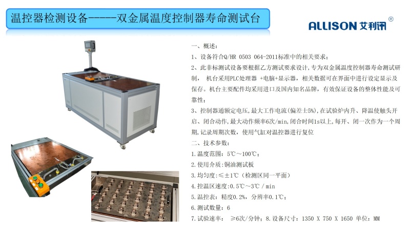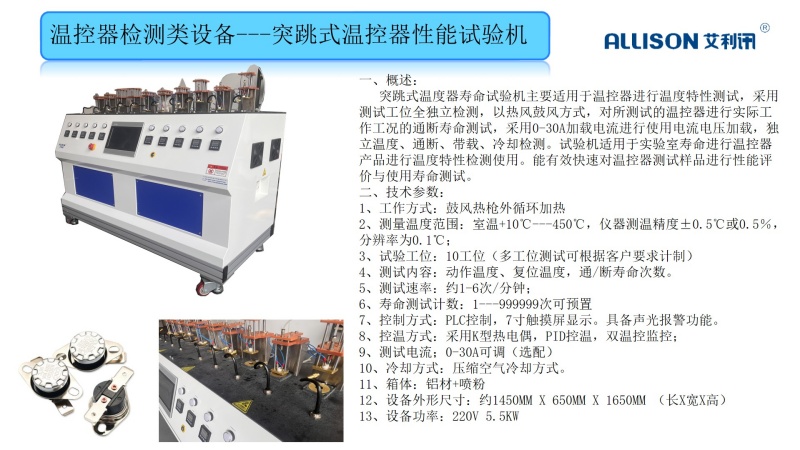 冷热交替温控器性能检测台,广泛适用于温控器行业、电子行业,石油化工,家用电器等多行业。主要针对温控器、温度传感探头等性能检测而研发的设备。