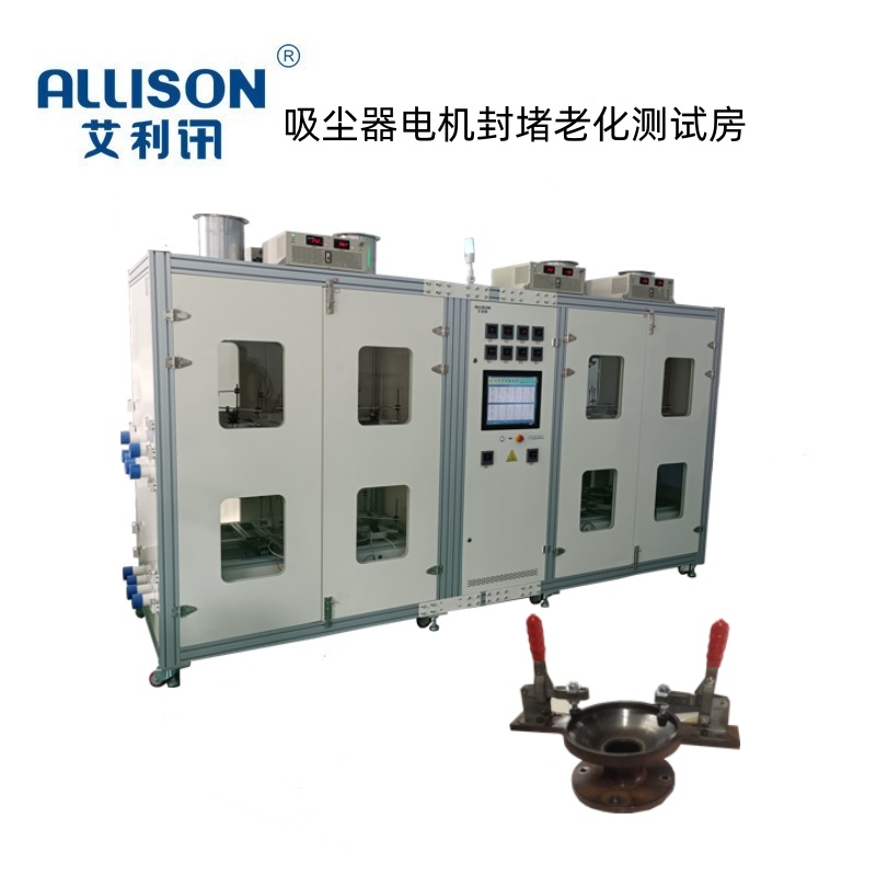 吸尘器电机封堵寿命测试房,适用于家用电器吸尘器电机长时间封堵寿命试验。适用于交流式与直流式电机老化测试。通过切换不同孔径大少,以模拟测试电机在实际使用中,出现的封堵情况。寿命测试房主要组成部份由测试房体,寿命测试机柜、中控系统、排风系统、进风系统、温度监控等组成。测试房体内部整个测试与监控,由控制系统对测试柜中的各工位进行实时电压,电流、测试环境温度等参数进行实时监控与记录相关测试数据。各测试机架具有对产品在寿命与性能检测过程中异常进行报警。