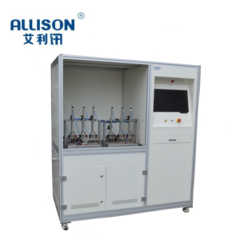 温控器的接线片与测试台上触点牢固接触,然后将探头通过水槽孔插入水中浸没探头,将温控器调至最高温度控制点,勿后对水加温至温控器动作时,观察水温读数和温控器读数之差,及开通和断开时水温读数之差,升、降温速度不能超过1K/min,测试结果应符合温控器的关断温度误差为土5°C,通断差为5°C±3°C ;重复性:重复温度特性10次测试;系统记录有效连续通电时间,接通/断开指示灯显示。设备具有通用性强,操作简单,控制方便,故障率低等优点