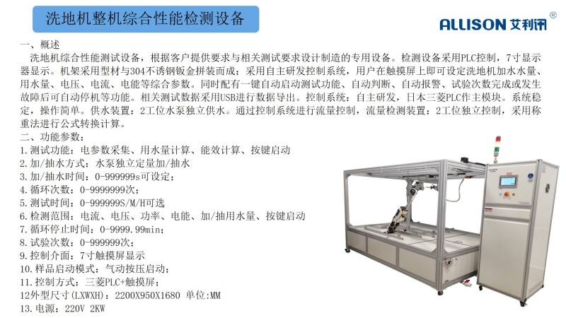商用洗地机移动床主要适用于对洗地机移动老化测试,通过长时间的移动老化测试,判断清洁洗地机在不同的测试地面中的使用寿命试验。用户可根据不同的测试环境,在测试台面上铺设地毯、硬地板、地砖等材料。通过PLC控制与传送机构,使洗地机在测试台上相对做环形行走动作。以设定好的速度在不同的工作台面上作往复直线行走运动