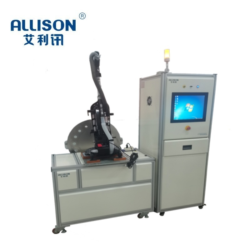 洗地机钓鱼拍打测试台主要针对于洗地机、吸尘器等家用电器产品中的手柄、地刷头、等整机零配件性综合强度耐久性寿命测试。减速电机带动相对应的夹具,对测试中的手柄进行两端夹紧固定,伺服传动机构带动整机产品进行拍打测试。测试台采用PLC程式控制并通过7寸触摸屏进行相关参数设定与记录。设备采用铝型材拼装而成。喷粉钣金外拼装,美观大方。具有运行稳定,操作方便等优势