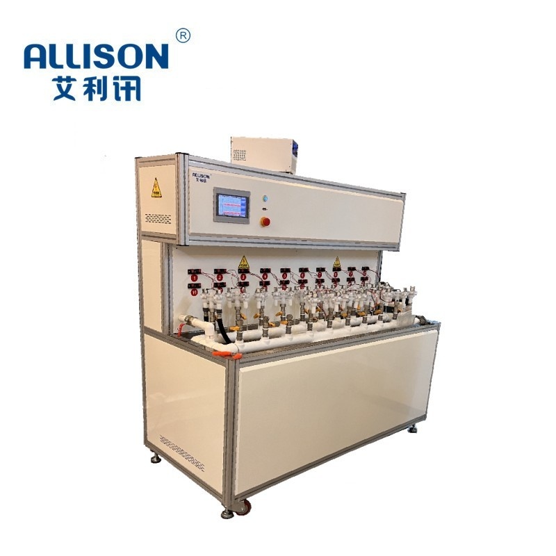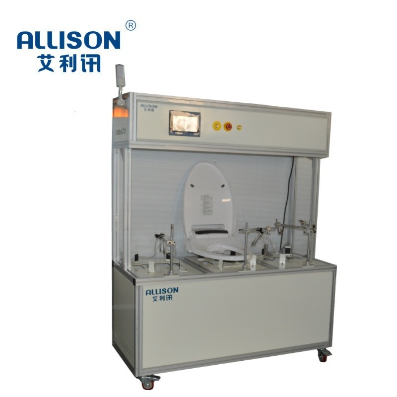 坐便器翻盖老化寿命测试设备主要适用于对智能马桶翻盖进 行连续性与周期性的寿命检测。通过红外检测装置检测开关盒动作,并记录测试次数。通过系统设定与控制,对马桶盖翻转动作进行长时间的通/断寿命测试。整个设备系统由PLC程式控制,人工快速安装,一键启动测试模式。系统配套工作运行指示灯,自动检测各大系统运行情况。控制系统为自主研发 PLC 控制。采用 PLC 及17寸触摸屏控制系统,设备运行控制通过。控制系统并带异常、故障报警、等功能