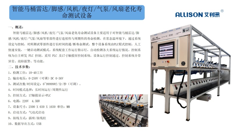 智能马桶风温组件老化测试设备测试设备主要适用于对智能马桶风温组件进行连续性与周期性的老化寿命试验。通过测试平台,对风温组件进行,通、断、风温温度进行控制与数据采集并记录相关测试次数。通过PCL系统设定与控制,10寸触摸屏显示,采用程式控制老化测试动作,以通时间、断时间、测试次数、周期次数、温度监测等,对所测试风温组件进行长时间作进行长时间的通/断寿命测试。整个设备系统由PLC程式控制,人工快速安装,一键启动测试模式。系统配套工作运行指示灯,自动检测各大系统运行情况。控制系统为自主研发 PLC 控制。采用 PLC 及10寸触摸屏控制系统,设备运行控制通过。控制系统并带异常、故障报警、等功能。