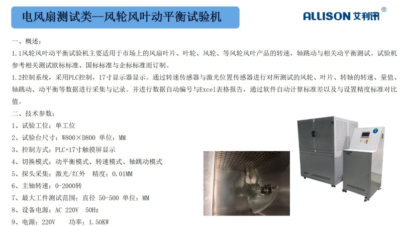 1.1风轮风叶动平衡试验机主要适用于市场上的风扇叶片、叶轮、风轮、等风轮风叶产品的转速,轴跳动与相关动平衡测试。试验机参考相关测试欧标标准、国标标准与企标标准而订制。