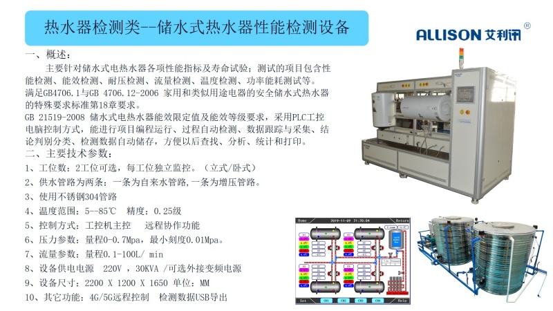 内胆保护电流测试台,参照QB/T2590-2003《贮水式热水器搪瓷制件》要求; 对搪瓷内胆的保护电流进行测试; 测试台采用PLC主控, 电脑组态友好灵活运用, 显示测试过程中的实时动态;测试数据实时采集, 实时显示,相关测试数据自动生成测试报表,可进行打印; 测试台主要配件采用进口配件,工作稳定可靠,操作简单方便