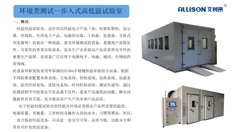 此设备外框架构采用外彩钢内SU304不锈钢保温库板组合而成,根据不同的要求配置本体系统、主电系统、控制系统、加热系统、加湿系统、温度控制系统、进排风系统、时间控制系统、测试负载等,通过此测试程序可检杳出不良品或不良件,是客户迅速找出问题、解决问题提供有效手段,充分提高客户生产效率和产品品质。
