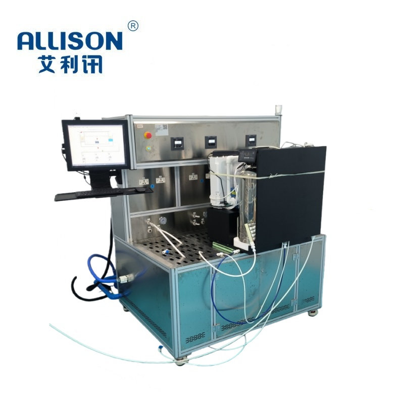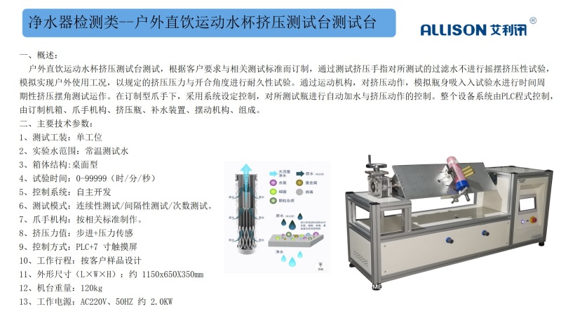净水器水效整机功能测试台,根据客户提出的相关测试要求与参考GB34914-2021相关标准而设计。测试系统主要适用于对净水机整机性能检测、水效测试等综合使用工况进行评价。适用于产线与实验室测试使用,设备操作简单,无须专人操作。