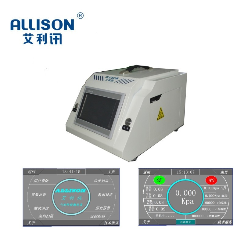 高压型气密性检测设备是运用高压气源作为主动力源,对所检测产品进行高压性密封性检测;测试台采用PLC主控,触摸屏中文显示操作;采用气动原理快速装夹产品,耐磨硅胶做为密封元件,通过高精密压力变送器检测产品内部在压力变化差与所产生的压力上下限进行对产品密封性的判断。夹具根据客户提供产品设计对多样化产品最高达到90%以上的通用性夹具。测试过程分布进行,OK自动进入下一步检测,NG对应指示灯亮,并声光报警;检测设备所用配件采用进口及国内知名品牌,工作稳定可靠。