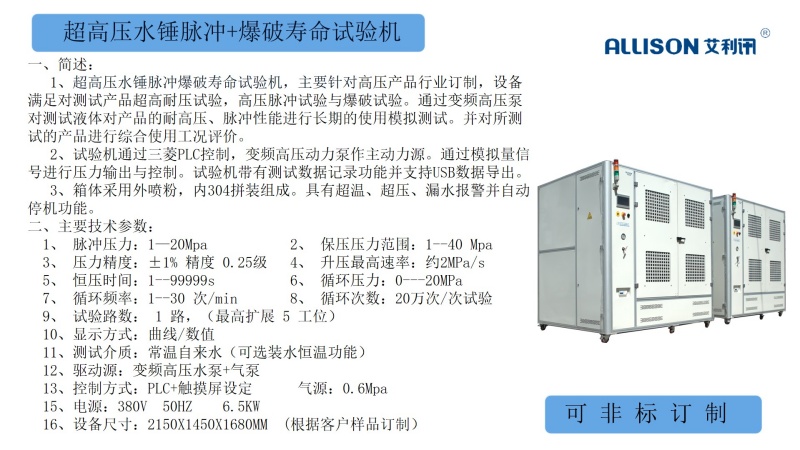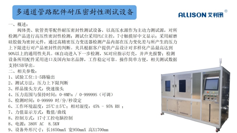 移动式耐压水密封性测试设备,以自来水源作为主动力测试源,对所检测产品进行高压性密封、耐水压检测;测试台采用PLC主控,7寸触摸屏中文显示;采用便捷式移动测试,方便对大型产品进行测试对接。测试设备采用耐磨硅胶做为密封元件,通过高精密压力变送器检测产品内部在压力变化差与所产生的压力上下限进行对产品密封性的判断。夹具根据客户提供产品设计对多样化产品最高达到90%以上的通用性夹具。OK自动进入下一步检测,NG对应指示灯亮,并声光报警;检测设备所用配件采用进口及国内知名品牌,工作稳定可靠。操作简单方便,相关测试数据支持USB导出。