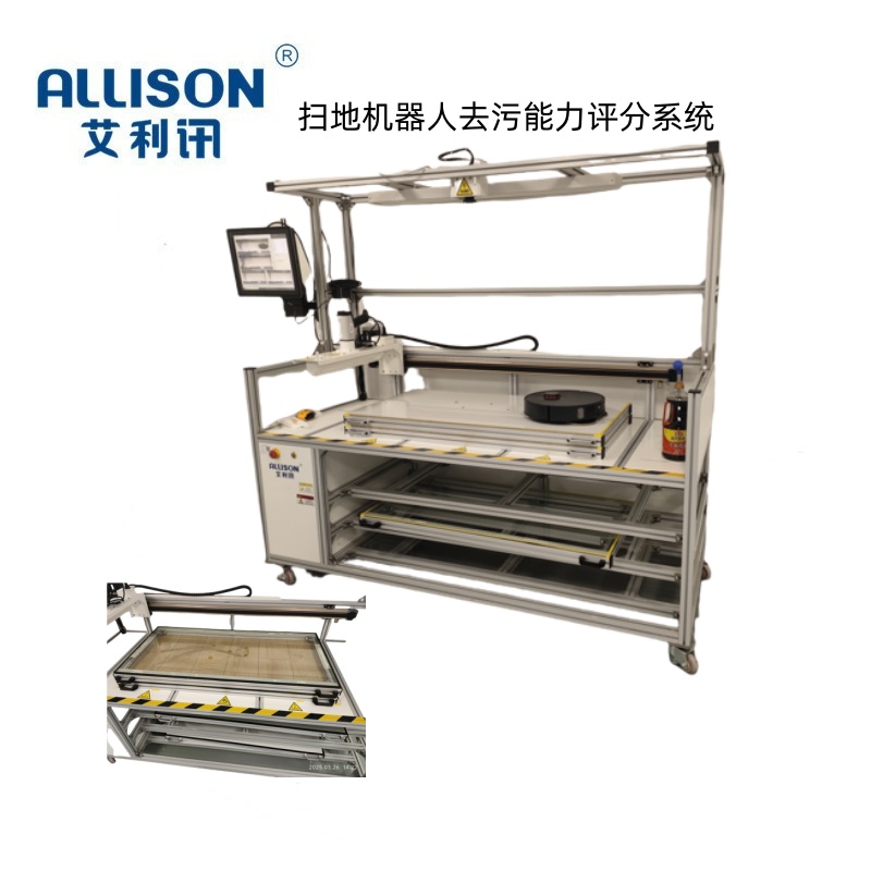 主要用于对测试扫地机器人在规定空间范围,通过不同的地板而产生的最大驱动力测试。采用17寸显示器与PLC进行相关数据记录与力值采集。实时的记录相关的测试驱动力值,并以曲线方式显示。相关测试数据可通过 USB 数据导出。以方便测试人员对扫地机器人的驱动能力进行分析与研究。