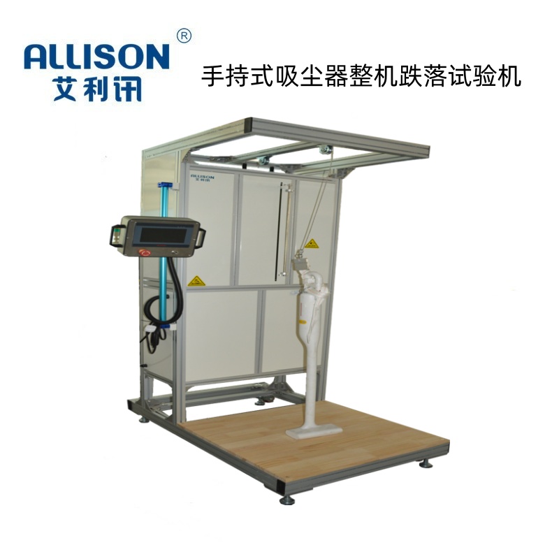 工业式吸尘器裸机跌落试验机,主要用于模拟桶式吸尘器在实际使用中的提放动作耐久性寿命测试。通过竖直提拉起立式吸尘器,然后垂直自由下落至松木板上。通过提高机构对测试吸尘器进行0-500MM范围内高度提升,电动释放机构对提升一定高度的吸尘器进行瞬间释放,至地刷底座跌落至松木板中心位置,通过PLC程式控制进行周期性试验。试验机通用性强,操作简单,控制方便,故障率低。