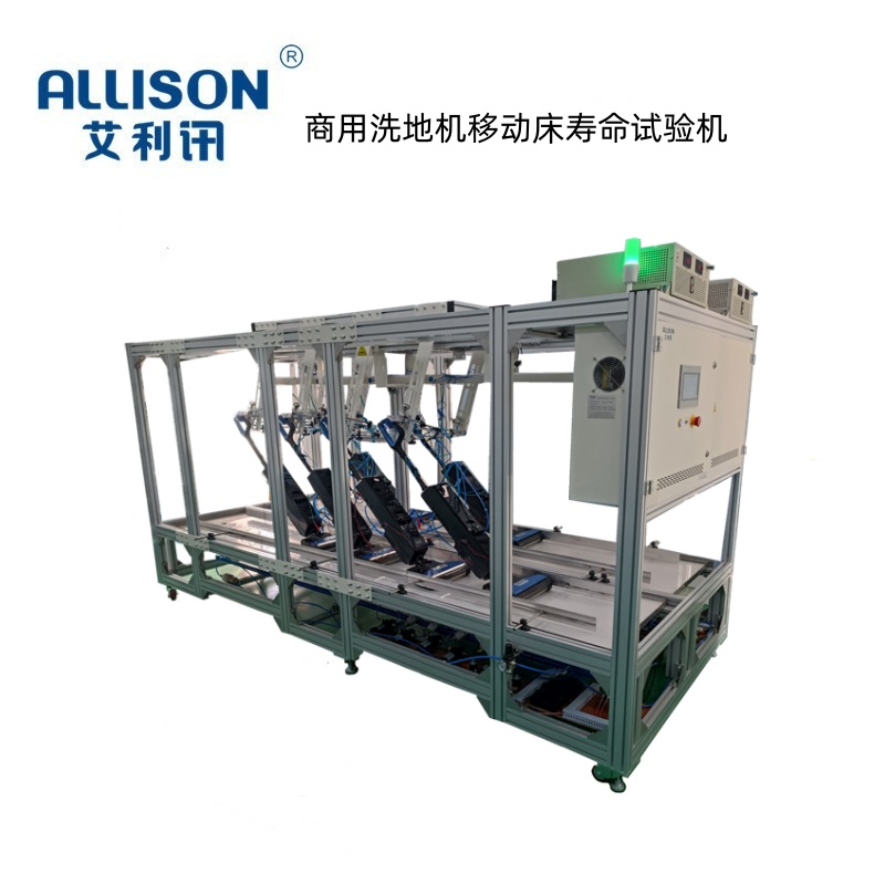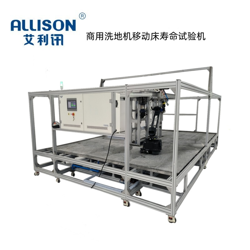 洗地机地刷冲击强度寿命试验机,主要用于测试地刷耐久性冲击试验,通过移动机构带动产品长时间进行地刷头撞击试验,从而验证洗地机地刷头的质量可靠性与使用寿命。