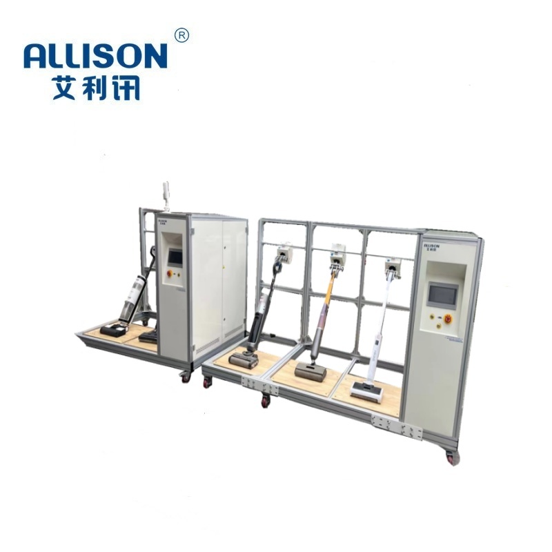 根据IEC60312等相关测试标准与要求进行制造和设计。试验机通过7寸触摸屏显示,PLC控制往复摆动动作。采用减速伺服电机,以0-90度带动吸尘器作角度弯折寿命测试
