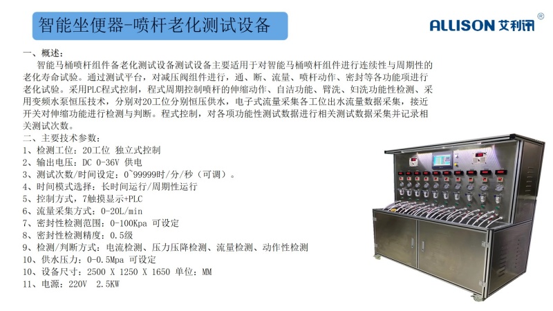 智能马桶雷达/脚感/风机/夜灯/气泵/风扇老化寿命测试设备主要适用于对智能马桶雷达/脚感/风机/夜灯/气泵/风扇等零部件进行连续性与周期性的寿命检测。在常态温环境下,通过系统设定与控制,对所测试零部件进行长时间的通/断寿命测试。整个设备系统由PLC程式控制,人工快速安装,一键启动测试模式。系统配套工作运行指示灯,自动检测各大系统运行情况。控制系统为自主研发 PLC 控制。采用 PLC 及17寸触摸屏控制系统,设备运行控制通过。控制系统并带异常、故障报警、等功能