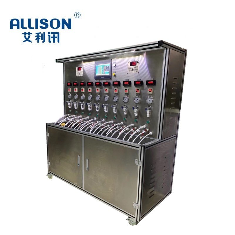 智能马桶减压阀组件备老化测试设备测试设备主要适用于对智能马桶减压阀组件进行连续性与周期性的老化寿命试验。通过测试平台,对减压阀组件进行,通、断、流量、保压、密封性试验。采用PLC程式控制,采用变频水泵恒压技术,分别对20工位分别进行相关测度数据控制采集并记录相关测试次数。通过PCL系统设定与控制,10寸触摸屏显示,采用程式控制老化测试动作,以通时间、断时间、测试次数、周期次数等程式测试流程