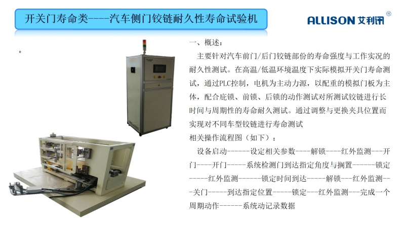 电冰箱开关门寿命试验机主要用于测试的门体与门铰链耐久性试验,检测门体的质量可靠性,适用对箱柜门体进行开/闭能力试验。以步进电机作为驱动源,带动推杆作往复转动运动,从而完成对柜门“打开与闭合”的往复动作, 通过PLC控制动作进行开启与关闭,模拟人手开关门的动作。通过PLC控制对产品进行上下开门测试动作,配合灵活多变的夹具,可满足多种洗衣机/电烤箱门的型式要求,通用性强,操作简单,控制方便,故障率低。