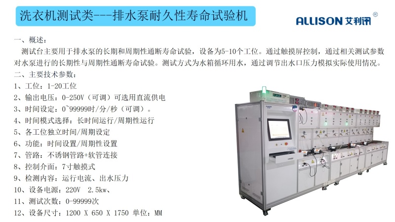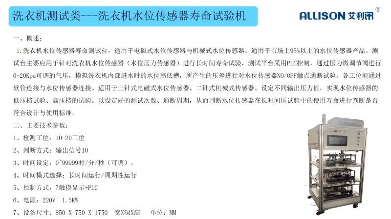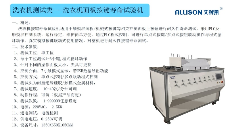 进水管脱扣寿命测试台主要用于快插式进水管脱扣耐久性试验,检测质量可靠性,适用对插式进水管进行脱扣断开/连接能力老化试验。以步进电机作为驱动源,带动夹具作插拔、脱扣运动,从而完成“打开与闭合”的往复寿命动作, 通过PLC控制,配合灵活多变的夹具,设备可满足多种洗衣机进水管脱扣寿命测试,通用性强,操作简单,控制方便,故障率低