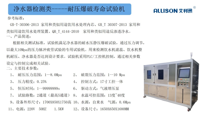 净水器水效整机功能测试台,根据客户提出的相关测试要求与参考GB34914-2021相关标准而设计。测试系统主要适用于对净水机整机性能检测、水效测试等综合使用工况进行评价。适用于产线与实验室测试使用,设备操作简单,无须专人操作。