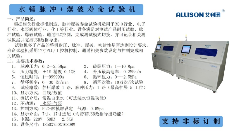 1.根据相关标准,设备满足产品的压力脉冲式试验、保压测试、压力爆破式试验。以1-20Mpa的压力对所测试产品进行高频压力脉冲试验与爆破性测试。对所测试产品进行综合性能评价。