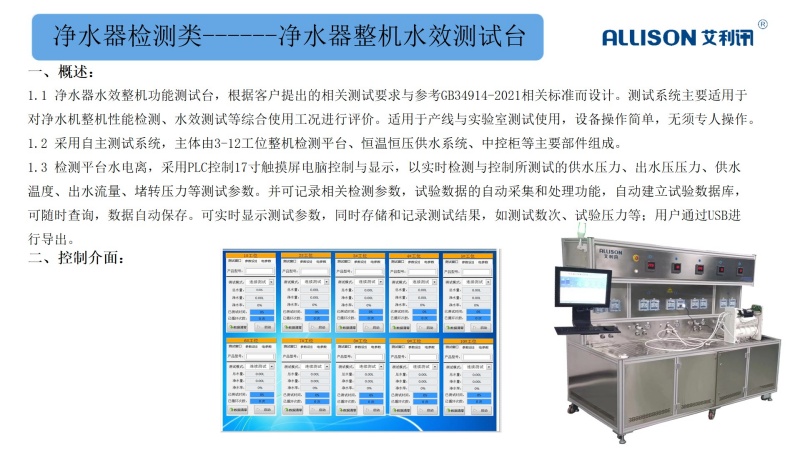 净水器滤芯密性检测台主要用来对净水器滤芯、整机等进行高低负压密封性检测。根据相关测试标准与行业检测标准,采用直压式压降法对所测试的滤芯/整机进行密封性测试。机架结构采用工业铝型材拼装设计,采用多工位独立检测,以压缩空气作测试驱动源,通过精密微调阀进行测试压力调节。以高精密压力变送器对所测试工位进行压力压降检测,由PLC进行数据采集与分析,并判断各工位合格、不合格。通过控制系统自动判断,有效提供生产效率与人工出错率,大大提高检测速度及数据准确性。